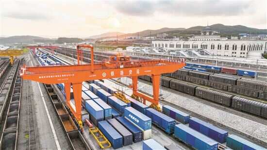 ■7月12日,入境中欧班列在中国铁路哈尔滨局集团有限公司绥芬河站集装箱换装场进行换装(无人机照片)。新华社发