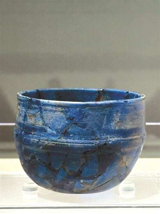蓝色弦纹玻璃杯,东汉,1988年9月合浦红岭头M11出土,合浦汉代文化博物馆藏。潘玮倩/摄