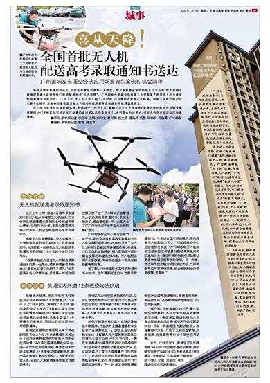 当天上午11时,载有4份高考录取通知书的无人机从华南理工大学启航,约30分钟后缓缓降落在黄埔区长岭街道万科山景城,全程约25公里,这是全国范围内第一次由无人机全程配送的高考录取通知书。