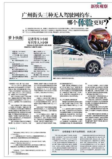 “啊,它怎么那么聪明?”“呀呀呀,你别变线啊!我好害怕!”“车上还可以自己点歌看视频,我也想叹一下啊!”7月13日下午,作为一名驾龄十多年的女司机,我和同事花了十个小时,采用车内体验和车外跟驶的形式,全面了解广州街头目前已有的三款无人驾驶网约车。或惊叹,或紧张,或羡慕,文章开头的三句话,都是我在驾驶跟车过程中的真实反应。全程体验下来,我和同事不由得感叹:未来已来。