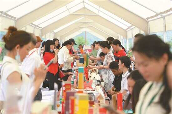 ■在2023年“国际茶日”中国主场广东(清远)分会场开幕式现场,众多游客正在品尝和购买英德红茶。(资料图)
