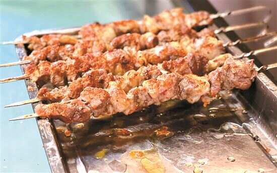 再者,推荐这家面积小小的“老字号故乡烤肉店”(店名就叫这个,跟是不是“老字号”没关系),主打羊肉串和凉皮,羊肉串4元一串,十分实惠。