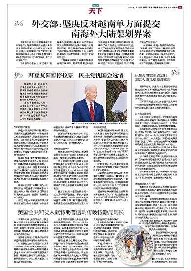 “越南单方面向大陆架界限委员会提交南海外大陆架划界案,其相关主张涵盖中国南沙群岛的部分区域,侵犯了中方的领土主权和海洋权益,违反了《联合国宪章》《联合国海洋法公约》等国际法,违背中越两国签署的《关于指导解决中越海上问题基本原则协议》和中国与包括越南在内的东盟国家签署的《南海各方行为宣言》。”林剑说,“中方对此坚决反对,已向越方提出严正交涉。”
