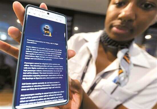 ▲7月19日,在加拿大多伦多比利·毕晓普机场,一名波特航空公司的工作人员用手机显示因技术故障取消航班的网络通知。