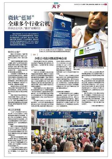 “蓝屏”即表明微软操作系统陷入瘫痪,影响了全世界多地机场办理值机和预订机票以及医疗和银行系统登录、电视广播节目播出、超市和电信系统运作等,给人们日常生活造成不便。一些地区的港口运营、物流运输也受到影响。