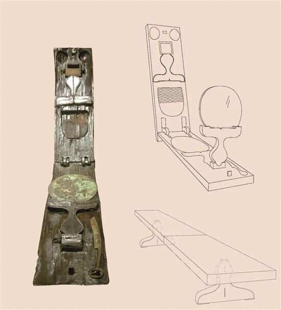 ▲湖北枣阳九连墩一号楚墓出土的便携式漆木奁及铜镜放置图、倒置小几图