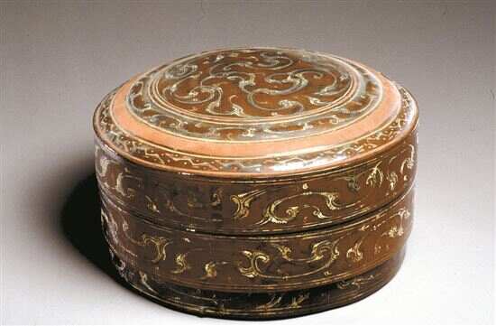 ■西汉双层九子彩绘漆奁,高20.8厘米,直径35.2厘米,出土于长沙马王堆一号汉墓,现藏于湖南省博物馆。