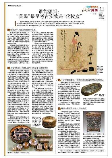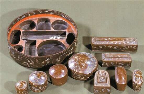 例如长沙马王堆三号汉墓出土的《双层九子彩绘漆妆奁》,分上、下层,上层放手套三双,丝绵絮巾、组带、绢地“长寿绣”镜衣各一件;下层装九个小漆盒,内盛各类梳妆用品。器表用油彩绘云纹。湖南省博物馆研究员聂菲认为:这相当于是一套化妆用品,应该是一号墓主人轪侯夫人辛追生前的化妆用品。她还介绍,“五子奁内盛放有一面铜镜、镜衣、角质环首刀、角质笄、镊子、木梳、木篦等梳妆用品。尤为值得关注的是,在五子奁里还发现了一枚“妾辛追”印,说明一号墓主人叫辛追,即轪侯的夫人。”