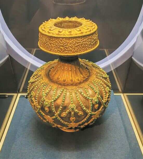 ■展出的银质嵌松石璎珞纹尊胜瓶。 新华社发