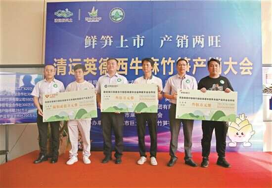 在本次产销大会上,英德市农业农村局、英德市麻竹产业协会分别和工商银行英德支行、农业银行英德支行签订授信协议,成功为本地麻竹笋行业授信20亿元,五家银行与六家麻竹笋经营主体签订贷款协议,成功发放贷款金额2200万元。截至目前,已累计发放麻竹笋产业贷款约7.2亿元,其中今年发放贷款约3.5亿元。同时,清远市人民财政保险公司正式发布2024年麻竹笋价格保险,设定0.9元/斤的“兜底”价格,为产业健康发展保“价”护航。