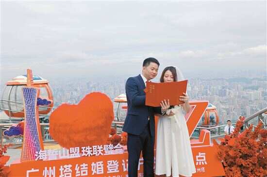 广州塔上国内最高的结婚登记户外颁证点、珠江客轮游船水上颁证点、西关特色户外颁证点……广州人婚姻登记不断上演花式浪漫,让国内很多城市的网友纷纷羡慕。
