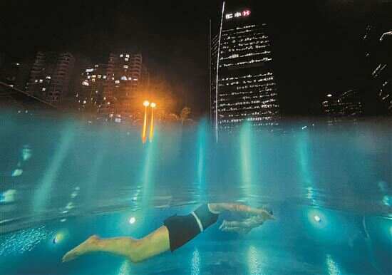 ■在城市高楼的缝隙中,也可以自由遨游在一片深蓝里。游泳池里,水上和水下就像是双重空间,两个世界。
