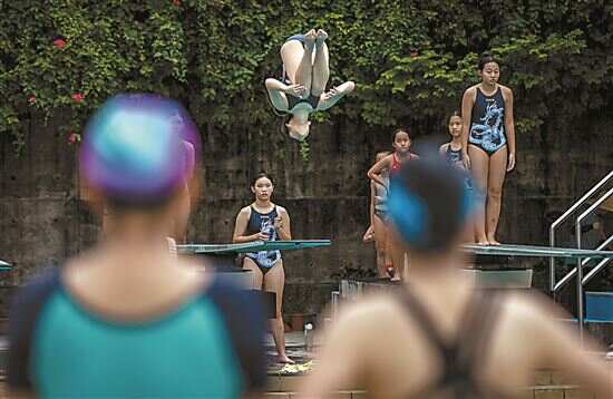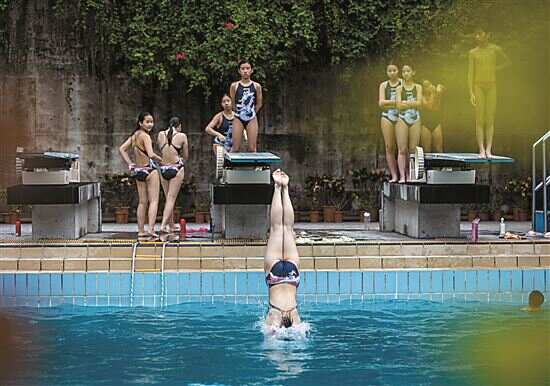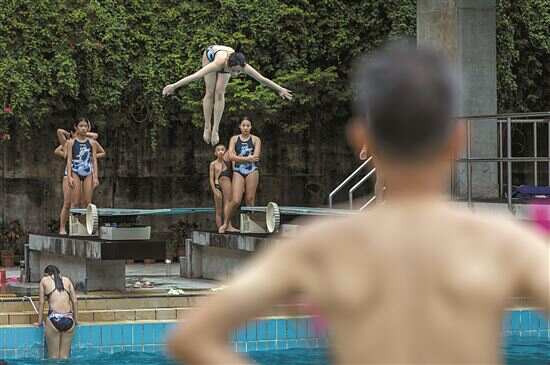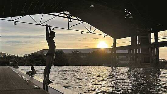 ■番禺某创意园泳池,一名游泳者在下水前进行拉伸训练。