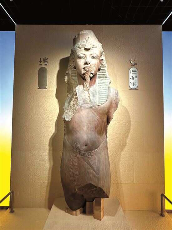 日前,记者在“金字塔之巅”展厅也看到了萨卡拉地区一件新近出土的“绿脸棺”。这件人形棺被竖起展示,目光有神,胸前被绘制多层项链。其脸部的绿色,据介绍,“象征着传说中死而复活的奥赛里斯,同时也代表泛滥的尼罗河”。