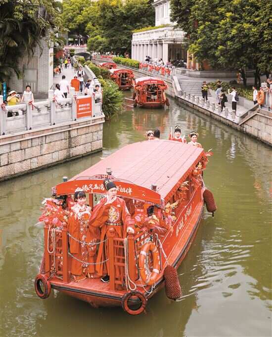 ■身着传统中式婚服的新人们搭乘游船“囍”游荔枝湾涌。新快报记者 邓迪/摄