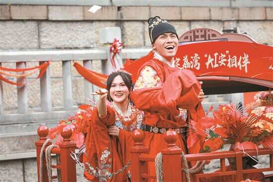 当天上午,来自不同行业和地区的新人们在亲朋好友的陪伴下,身着传统中式婚服,齐聚荔湾湖公园。新人们乘坐着车队,沿着华贵路、长寿路、多宝路等承载着美好寓意的幸福之路“爱”游西关。随后,搭乘游船“囍”游荔枝湾涌,携手踏上新的幸福旅程。