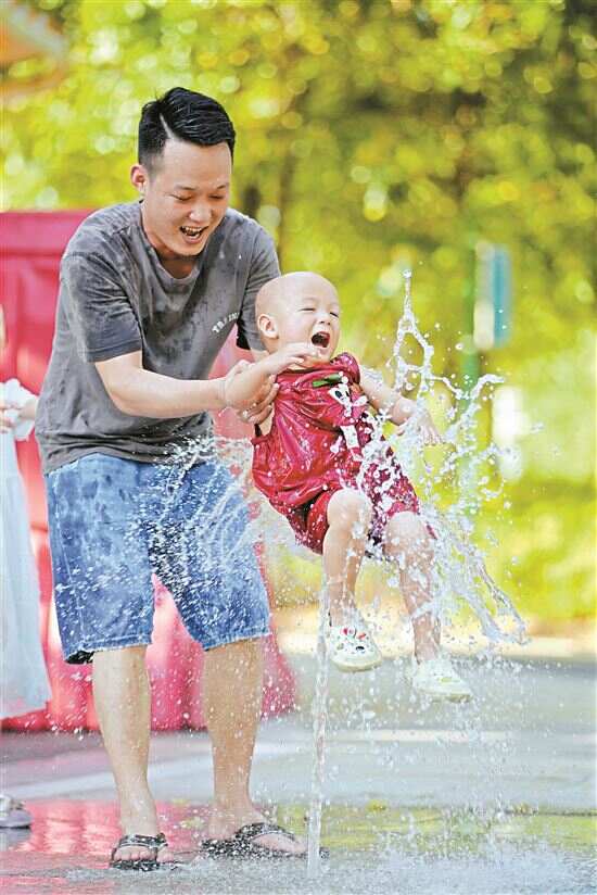 ■近日,广州进入“烧烤模式”,天气炎热,不少市民带着孩子前往广州市儿童公园玩水。 新快报记者 郭思杰/摄