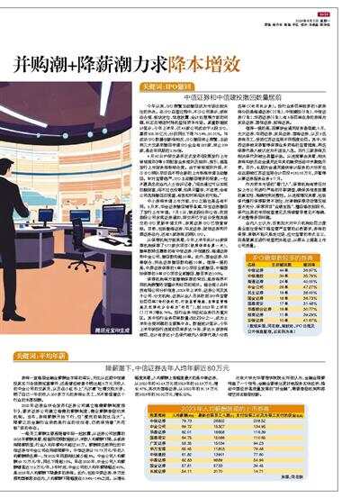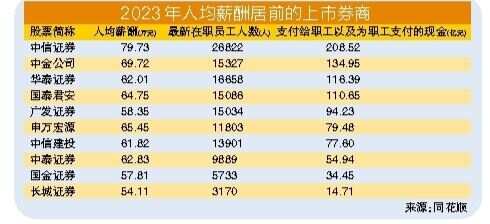 一般员工薪酬主要是随着年报一起披露,从证券公司披露的2023年薪酬来看,根据同花顺数据统计,半数人均薪酬下降,头部券商降薪明显,行业人均年薪均不超过80万。薪酬排名前两位的中信证券与中金公司在持续降薪中。中信证券以79.73万元/年的人均薪酬排名第一,与2022年同期相比减少超3%。中金公司人均薪酬69.72万元/年,同比下滑超10%。早在2020年,中金公司人均薪酬曾高达116万元/年,3年时间,中金公司的人均年薪降幅近40%,是2023年人均薪酬下降最多的券商。此外,包括中原证券、申万宏源和国泰君安在内,人均薪酬下降幅度在0.34%-14%之间。从增长幅度来看,人均薪酬上涨幅度最大的是中泰证券,从2022年的42.63万元到2023年的62.83万元,增长47%,其次为国海证券,从2022年的31.14万元到2023年的38.02万元,增长22%。