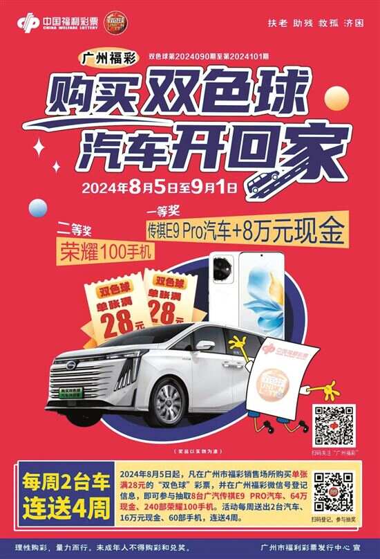新快报讯 记者陆妍思 通讯员郭新庆报道 由广州市福利彩票发行中心主办的“购买双色球 汽车开回家”活动已于2024年8月5日起在全市范围启动。该活动将持续开展4周,每周送出2台广汽传祺E9 PRO汽车加8万元现金、60部荣耀100手机。