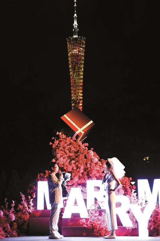 ■七夕节一对恋人在广州二沙岛以广州塔为背景完成浪漫求婚仪式。 新快报记者 观显锋/摄
