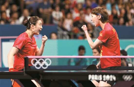 北京时间昨天23:25,在巴黎奥运会乒乓球女子团体决赛中,由陈梦、孙颖莎、王曼昱组成的中国队战胜日本队,夺得金牌。至此,中国乒乓球队包揽本届奥运会全部五枚金牌。(新华社发)