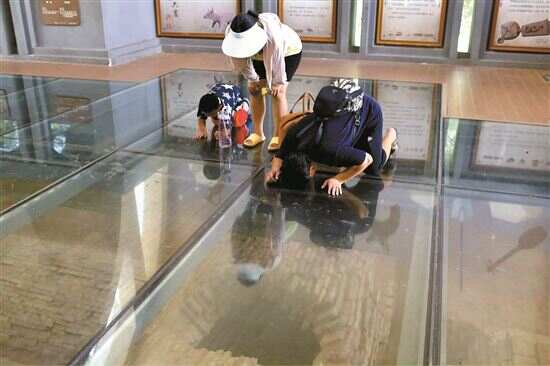 近日,记者在现场看到,不少游客都饶有兴致地透过玻璃地板,去细细观察东汉砖室墓的细节。展板上注明,该墓平面呈“中”字形,分墓道、横前堂、后室三大部分;拱券基本保存,可清楚看到广州东汉时期已能娴熟运用砖头砌拱技术。