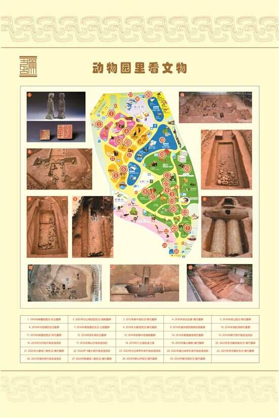 自1956年以来,配合广州动物园建设,市文物部门已先后在动物园内30多个地点发掘古墓葬近500座。其中,1为1956年麻鹰岗西汉-东汉墓葬,6为2016年中型兽区东汉墓葬,8为2016年大象馆西汉-唐代墓群,9为2016年澳洲馆西南侧东晋墓葬,19为2022年猴山南朝-清代墓群,11为2016年熊猫馆西汉-宋代墓群,3为2012年犀牛馆东汉-明代墓群,21为2022年大象馆二期东汉-清代墓群,25为2023年羚羊展区东汉-清代墓群,27为2024年熊猫馆二期东汉-清代墓群。
