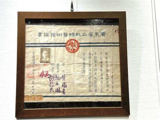 此外,还有多家不同机构的文献信息,几乎可以串联起近现代广东美术教育的基本脉络,例如,1928年,烈风美术学校的毕业证书,时任校长何三峰,据广东画院资料,岭南大家黎雄才于1931年就肄业于广州烈风美术学校,后赴日本求学;成立于1940年4月的“广东省战时艺术馆”文献,也罕见地展出,这是广东省立艺术专科学校的前身,艺术馆是为培训抗战宣传骨干而设的,馆长由当时的教育厅厅长黄麟书兼任。内设音乐、戏剧、美术三科,分别由黄友棣、赵如琳、胡根天负责。这次展出的是该艺术馆第一期第一号的毕业生证书,馆长黄麟书、副馆长赵如琳、部主任胡根天三人签名,尤其珍贵。据资料,该艺术馆每期学员培训两三个月就出来参加工作。当年底迁至韶关五里亭,改名为“广东省艺术院”,改为两年制。后为合符当时院校体制改名为“广东省立艺术专科学校”,赵如琳任校长。由于战局变化,敌机时常轰炸,校址多次迁移,到过连县、上窑、罗定等地。有所谓“三易校名、十迁校址”之称。“省艺专”在抗战中经历了坎坷艰难的路程,培养出一大批艺术人才,为唤起民众宣传抗战起到了重要作用。