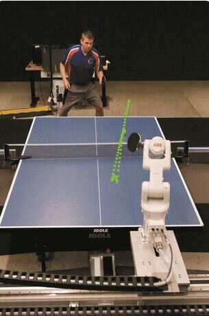 研发团队在预印本网站arXiv上发文介绍,这是首个在乒乓球比赛中达到人类业余选手水平的学习型机器人智能体,其主体为一个六轴机械臂,可通过底部滑轨前后左右移动。在与人类进行的29场比赛中,机器人赢得13场,胜率为45%。对战者皆是机器人未见过的人类选手,技能水平从初级选手到高级选手不等。