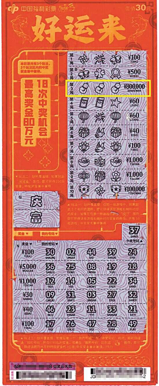 该款彩票单张面值为30元,11个奖级,18次中奖机会,奖金返还率为65%,最高奖金80万元。