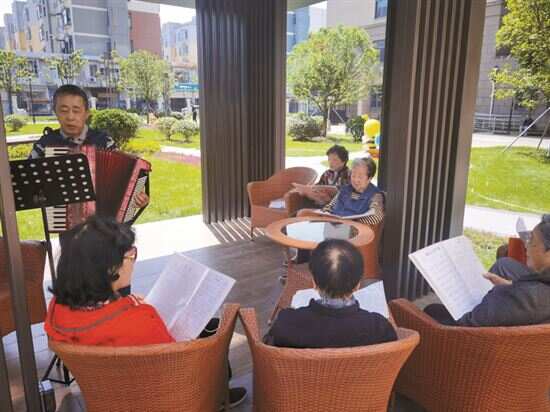 5月14日,天气晴好,吴江江陵康养中心内的小公园正式启用。蓝天白云,绿草如茵,微风徐来,72岁的朱成纲,与其他7位更年长的老人,第一次到小公园排练唱歌。