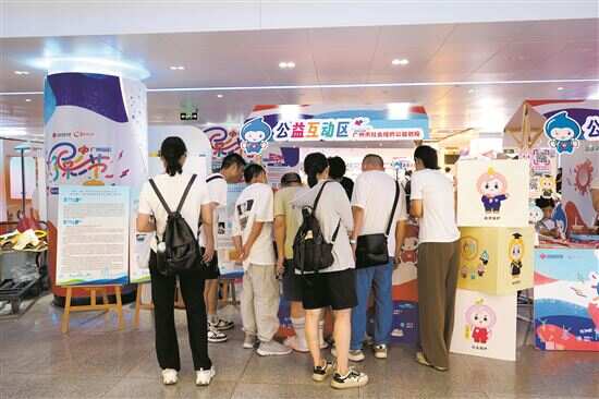 在公益慈善展示区,活动联动品牌公益金项目——广州市社会组织公益创投项目设置公益摊位“未爱护航·生态童行”。其中,“未”爱护航互动摊位围绕未成年人关爱、净网、维权三大主题,结合转轮盘、敲冰块等亲子互动游戏,激发亲子家庭对未成年人保护教育的兴趣,加强对培养未成年人保护意识的重视,营造社会关心、关爱未成年人健康成长的良好氛围;“生态童行”互动摊位则展示了生态环保周边文创红树林主题徽章与丝巾,并设置“海洋生态系统主题黏土制作”“低碳践行大富翁”等生态环保相关互动游戏,号召更多群体加入生态保护行列,共同践行绿色低碳生活理念。