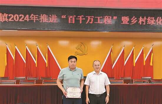 ■清远市阳山县大崀镇党委书记肖剑平(右一)为乡村绿化擂台赛一等奖颁奖。