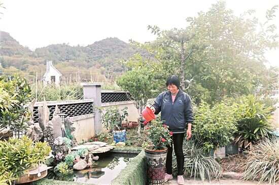 ■省美丽庭院户主黄美好给家里新添的盆栽浇水。