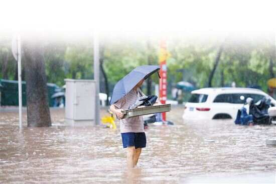 ■21日,广州市区出现了暴雨到大暴雨,在科韵路往黄埔大道的辅路上,市民涉水过街。新快报记者 郭思杰/摄