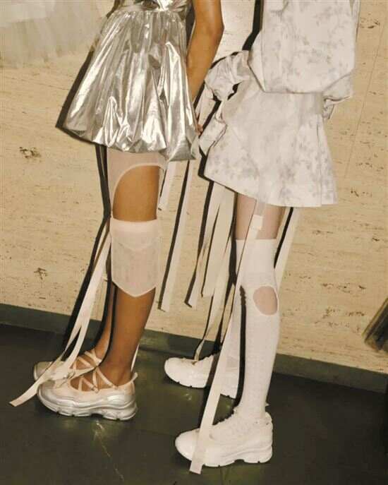 2023年运动鞋大底加传统玛丽珍鞋型是主流创作款式,今年随着芭蕾美学热潮愈演愈烈,更多融入如通过调色盘、尖轮廓、细绑带、丝带等元素运用,表达更多对千禧风格的创新思考;又或是加入金属、鞋面星星绣纹等凸显未来主义与朋克氛围;还有镂空网纱面料和珠宝、花卉点缀,在极端风格化元素碰撞中衍生新的时尚风格。