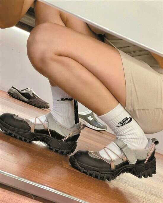户外鞋中的撞色绑带和防滑齿元素与玛丽珍鞋型结合,形成精致与粗犷的对比,是当下时尚圈最受欢迎的潮流之一。