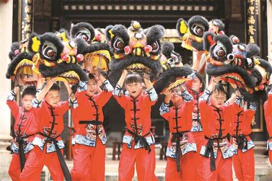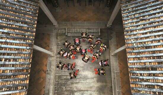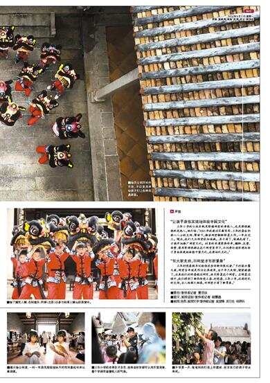■除了醒双人狮,在祠堂内,阿婷(左四)还参与到单人狮头的表演中。