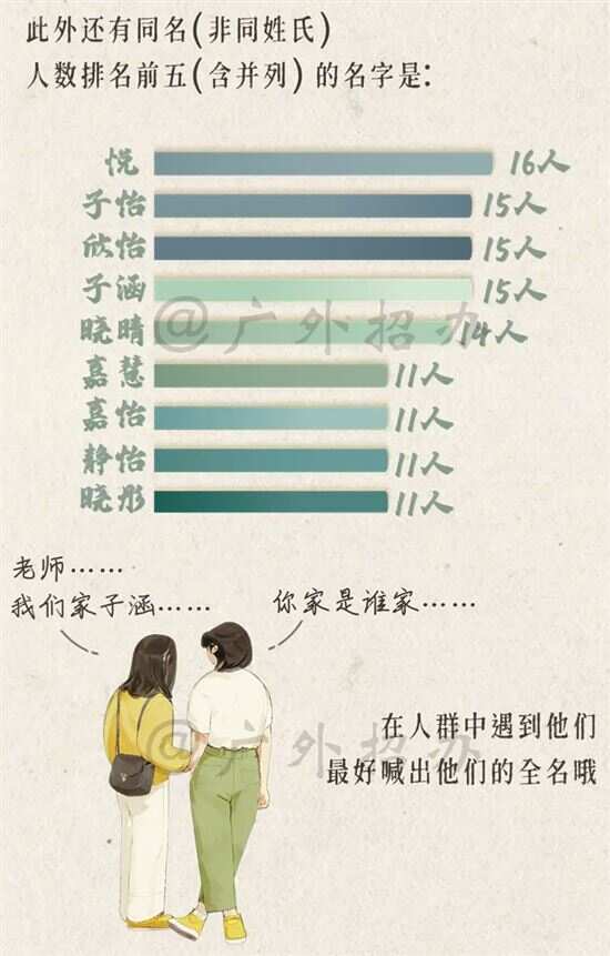 “×浩”“×涵”“×怡” 仍是今年新生的爆款名。华师喜迎多个“静怡”“宇轩”和“张涵”,广东工业大学重名最多的名字为“黄浩”。“子涵”“子怡”“欣怡”扎堆报考广东外语外贸大学,均以15人的同名(非同姓氏)人数并列排行第二名,仅次于16人同名的“悦”字。