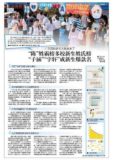 最小的新生15岁,最萌年龄差13岁,“×浩”“×涵”“×怡”仍是爆款名……近日,广东多所高校陆续公布了2024年新生大数据。从目前公布的高校来看,“陈”姓依然霸榜多所高校“姓氏榜”,而很多稀有的姓氏也悉数入库。整体来看,2006年出生的萌新们,成为今年本科新生主力军。
