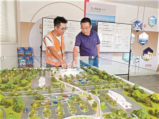 ◀保利长大茂名服务区提质升级工程项目党支部书记曹坤(左)介绍,柏桥服务区约能提供360个车位。