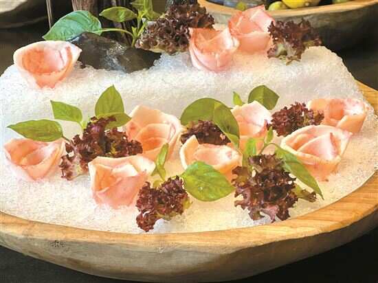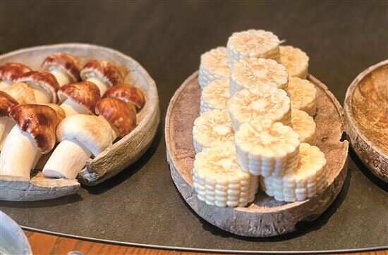 主厨是客家人,自身略带腼腆又多少有点强迫症,无论是菜品的摆盘还是吧台上用于展示当天新鲜食材的摆件,都好像是艺术气息爆棚的“假山”“盆景”“花艺”,只不过它们是由牛肉、蔬菜等食材搭成,看起来赏心悦目,让人充满食欲。