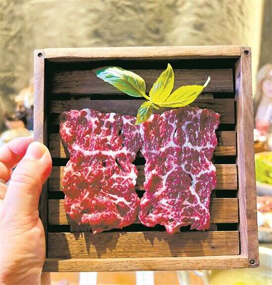 那一片雪花牛肉的纹理,简直如同艺术品一般,被放置在一枚小木匣子里,一片绿叶衬托,美艳不可方物,直让人发出“不舍得吃掉”的慨叹。这自然是不现实的,美食满足的是人的五感,从视觉盛宴启幕,到味蕾和精神层面的满足而结束,一切都是最好的安排。