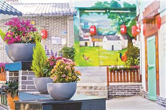 不同于传统乡村,石鼓社区中多数民宅并非一户一院,而是以楼房居多。街道沿线楼房的结构多是下层商铺上面住宅,走在其中却没有单调无趣之感。只见红花绿草点缀在门前、阳台、楼顶,色彩明亮的墙绘将一条条巷道点亮,墙上农耕文化、美丽乡村、乡风民俗等主题的墙绘更丰富了“美丽庭院”内涵,让普通的街巷实现了“一步一景”。