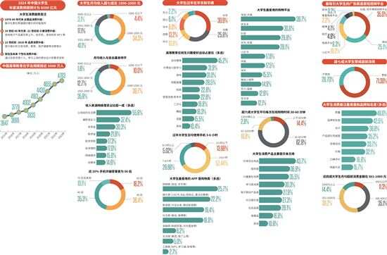 教育部的数据显示,中国在校大学生数量逐年增长,2023年中国高等教育在学总规模达到4763万人。大学生收入来源十分多元,其中家长给的生活费依然是主要来源渠道,占比为55.8%。其次则是兼职或实习(37.4%)、奖学金(30.3%)及助学金(21.9%)。可见家庭支持仍然是大学生群体经济来源的一个重要渠道,此外,许多大学生正通过兼职实习、争取奖学金和助学金等多种方式拓宽自己的收入渠道。
