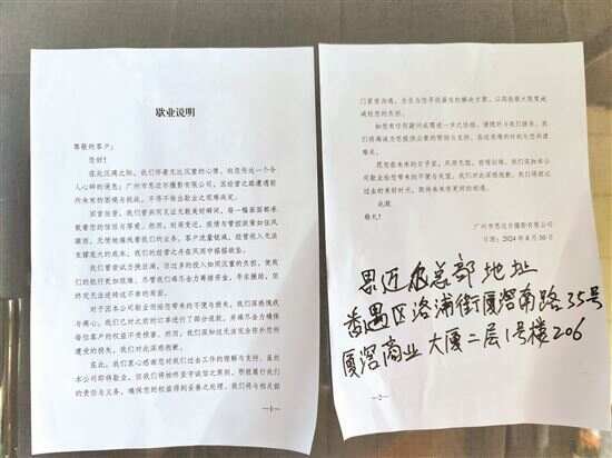 随后,记者来到位于天河区富星商贸大厦的珠江新城店,只见大门紧闭,玻璃门上贴出了一份既没有公章,也没有联系方式,落款时间为2024年8月30日的歇业说明。思迈尔儿童摄影在歇业说明中写到,因经营之路遭遇前所未有的困境与挑战,不得不做出歇业之艰难决定。该大厦物业方面表示,该门店在8月底悄然撤离,租赁合同还未到期,仍欠门店业主两三个月的房租,且无法联系到负责人。近日陆续有家长上门询问,物业方面正在就未使用的消费金额等情况进行登记,后续将提交给公安部门。