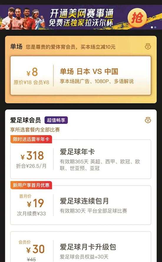 新快报记者发现,在9月5日比赛当晚在爱奇艺和爱奇艺体育App上观看本场比赛,可以选择支付18元观看单场,或者支付9元成为爱奇艺会员,利用兑换券来观看比赛。如果用户之前已经是爱奇艺体育的会员却没有兑换券的情况下,那么可以优惠为8元购买单场。在抖音平台上,爱奇艺的体育账号新爱体育也在售卖当晚的直播,需要99钻(安卓手机端为9.9元,苹果手机端则为15元)。