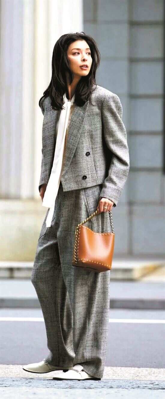 美拉德色系的包袋作为点缀出现在“一身灰”造型中,让造型更显雅致。