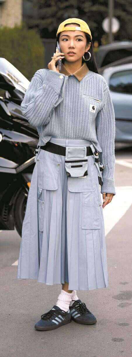 ▲蓝色为主,灰色为辅,可打造明媚又大气的风格着装。