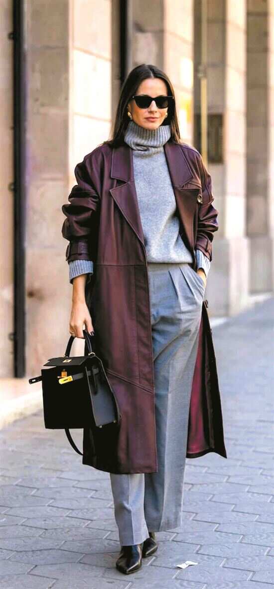 搭配的红色单品建议选皮革面料,更能彰显质感,将一身灰内搭烘托得更高级。